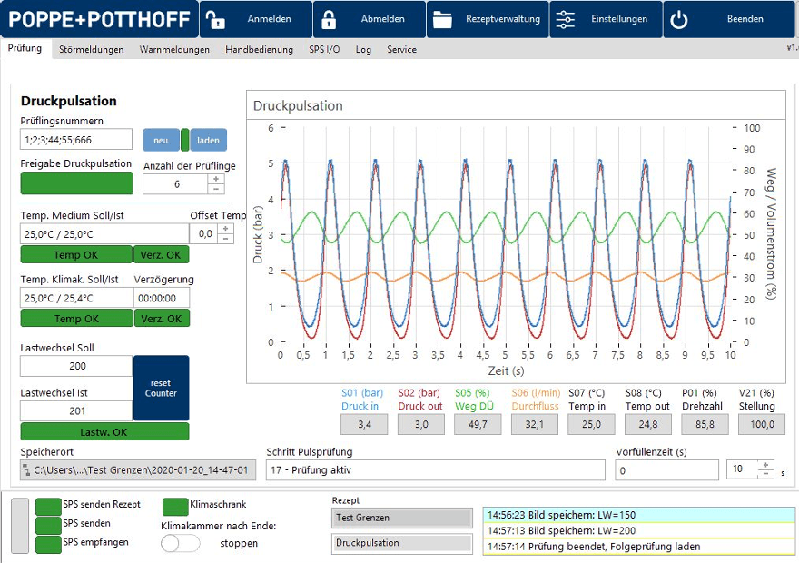 Die Druckwechselprüfstände von Poppe + Potthoff sind maßgeschneidertee Systeme zur Prüfung der Betriebs- und Dauerfestigkeit unterschiedlichster Komponenten unter realen Druckbelastungen. Die Prüfung erfolgt in Form programmierbarer Druckkurven – wahlweise als Sinus- oder Trapezverlauf. Für anspruchsvolle Anwendungen kann zusätzlich ein Nadelimpuls erzeugt werden, was auch als Druckschlagprüfung bezeichnet wird.